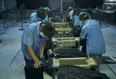 3.磨邊 磨爛 勾紗 將衣物在洗水前,人為地將褲腳,褲頭等一些特定部位用銳器刮爛,從而制成洗后的破爛懷舊效果 4.打搶.手針 用線將牛褲某些部位縫起,凸出的部位由于在洗水過程中受的的摩擦較多,從而掉色較嚴(yán)重,水洗效果也較明顯,而凹入的部位在洗水過程中受的的摩擦較少,從而掉色較輕,水洗效果不明顯。同沒做手針的其它部位形成深中淺的三種洗水效果 5.立體貓須 將衣物浸免燙樹脂并脫水后,在特定部位用夾子夾出需要的形狀,起伏度,然后再高溫烘焙,讓樹脂交聯(lián)定型,從而制出永久的立體褶皺效果 6.噴砂 是在洗水前,通過使用一些表面粗糙的物質(zhì)(如硼砂),通過噴槍在一定的氣壓作用下使沙打擊并摩擦布面而達(dá)到褪色的效果,噴砂的地方經(jīng)洗水后顯得較為自然地懷舊和泛白,給人較強(qiáng)隨意感 7.扎花 扎洗是在洗水的過程中將衣物以繩子等東西全部或局部扎起來后洗水,以達(dá)到洗后布面呈現(xiàn)隨意的深淺色對(duì)比,有浮云般的效果(類似扎染 8.馬騮 噴一些氧化劑,一般是高錳酸鉀溶液,讓衣物局部褪色,從而讓牛褲顯得自然地懷舊和泛白 9.噴色 抹色 將衣物在洗水后,用人手將涂料或者直接料涂抹或者噴灑在衣物表面,制作懷舊效果
